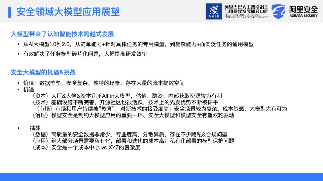 再接下来一个重要方向是大模型的安全性和可靠性。如何确保模型足够安全是我们要面临的问题。由于安全识别场景的容错率极低,只有确保了足够的安全性和可靠性之后,模型才能被部署上线。因此,安全性和可靠性将是未来面临的重大挑战,也是安全领域的永恒课题。最后要考虑的是成本优化问题。在保证效果提升的同时,如何实现成本上的优化,也是我们面临的主要挑战之一。