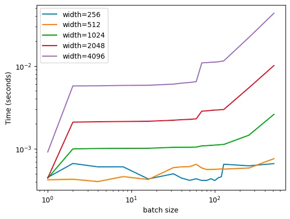 将批量大小从1增加到2、再增加到3都不需要额外的时间,之后才会线性增加。为什么会这样呢?这是由于并发性。现代GPU可以并发地运行这些操作。(实际上,在每个线程的基础上,GPU的速度比CPU慢)。
