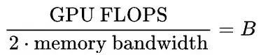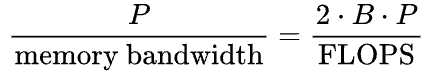 在计算模型推理时,我们通常会将模型视为单个块(block),但实际上模型由许多矩阵组成。当我们运行推理时,每个矩阵都被加载到内存中。具体来说,每个矩阵的块被加载到设备内存中,即共享内存单元(在A100上只有192KB)。然后,该块用于计算批次中每个元素的结果。需要注意的是,这与GPU RAM(即HBM)不同,A100具有40GB或80GB的HBM,但只有192KB的设备内存。因为我们不断地在设备内存中搬运数据,所以这在执行数学运算时会导致一个内存带宽瓶颈。我们可以通过计算模型大小/内存带宽比来近似传输权重所需的时间,并通过模型FLOPS/GPU FLOPS来近似计算所需的时间。使用多层感知器(MLP)时,FLOPS(每秒浮点运算次数)约为参数数量的两倍乘以批次中元素的数量(对于批次大小为b和一个m x n矩阵,FLOPS为2 * m * n * b,https://www.stat.cmu.edu/~ryantibs/convexopt-F18/scribes/Lecture_19.pdf)。因此,当当批大小小于FLOPS与内存带宽之比时,我们会受到内存带宽的限制。当批大小大于该比值时,我们会受到FLOPS的限制。需要注意的是,这种分析是针对MLP而不是卷积网络(例如ResNet50)。对于卷积网络来说,情况会变得更加复杂。