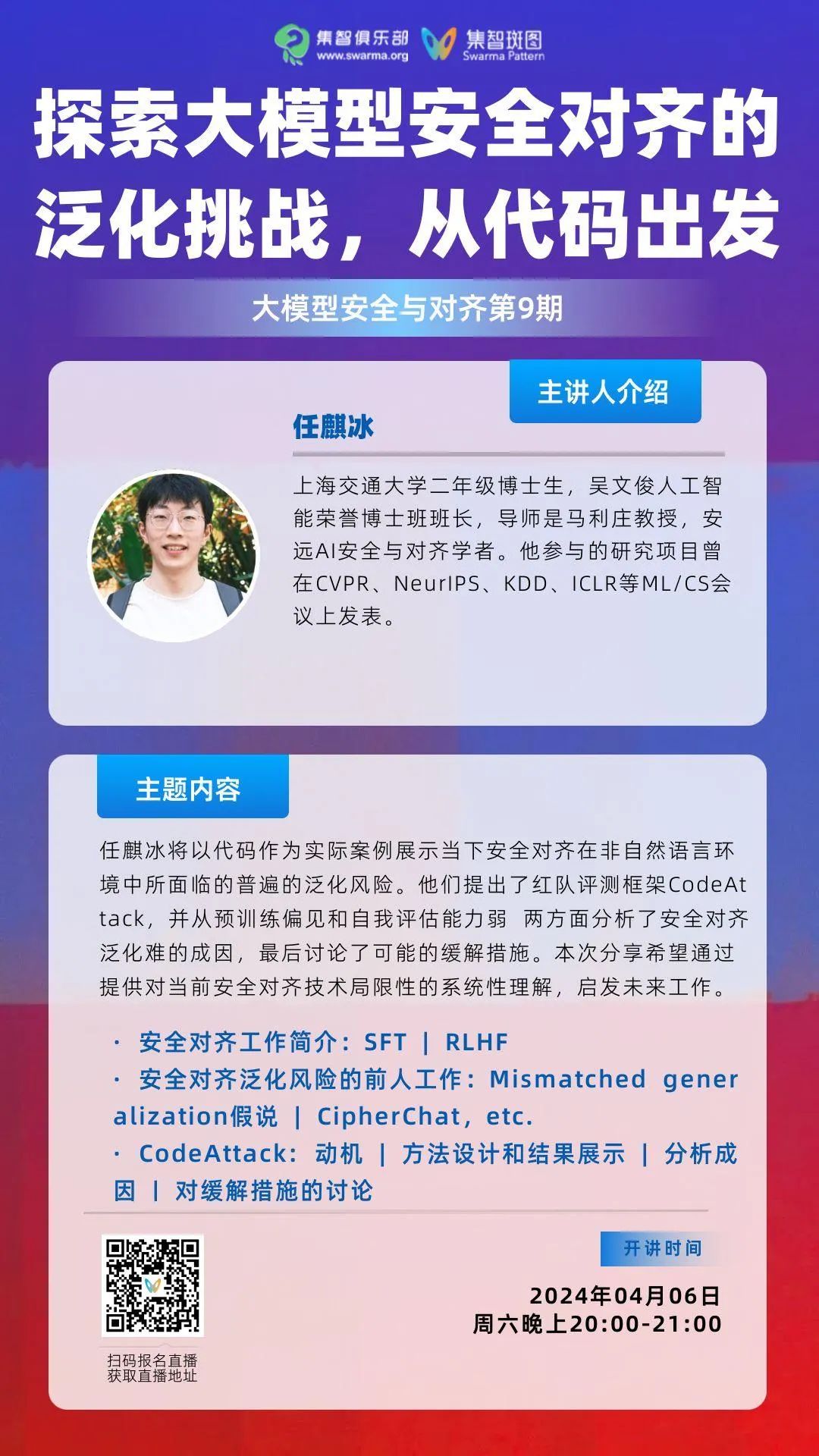 大模型安全与对齐的第九期,我们邀请到上海交通大学的任麒冰,他将以代码作为实际案例展示当下安全对齐在非自然语言环境中所面临的普遍的泛化风险。他们提出了红队评测框架CodeAttack,通过把有害指令建模为代码补全任务,在主流的大模型上诸如GPT-4, Claude-2, Llama-2-70B均取得了80%以上的攻击成功率。他们发现拉大代码对抗文本的分布和自然语言文本的分布之间的距离,会进一步提高攻击成功率。他们进一步从(1)预训练偏见和(2)自我评估能力弱 两方面分析了安全对齐泛化难的成因,最后讨论了可能的缓解措施。本次分享希望通过提供对当前安全对齐技术局限性的系统性理解,启发未来工作。
