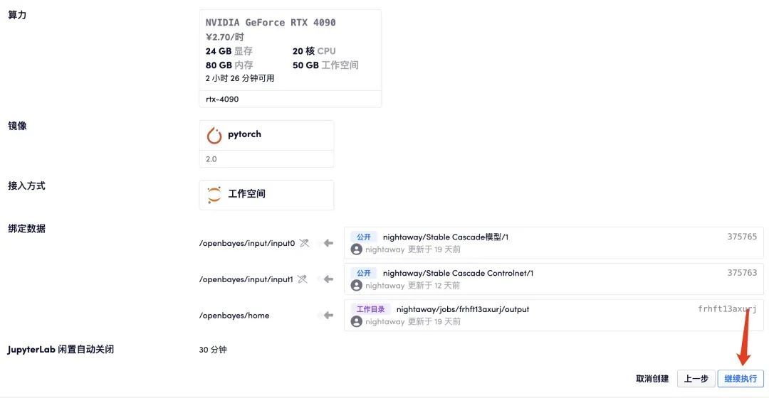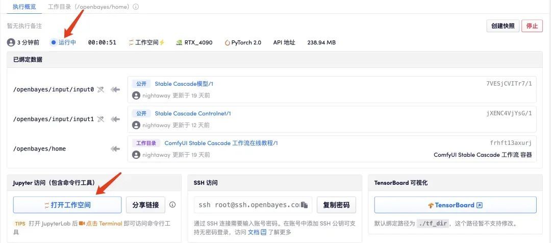 5. 点击「继续执行」,等待分配资源,首次克隆需等待 2 分钟左右的时间。当状态变为「运行中」后,点击「打开工作空间」。