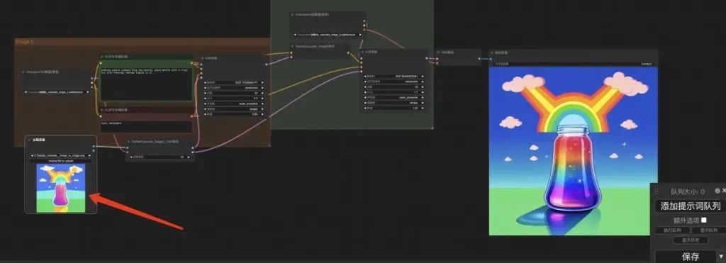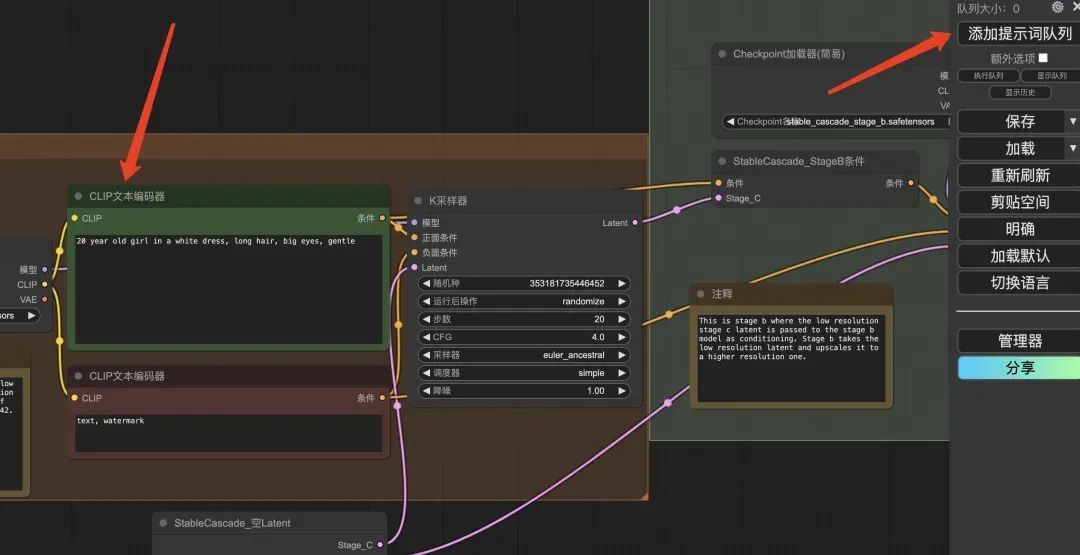 2. 在 CLIP 文本编码器中输入英文提示词,点击「添加提示词队列」,只需 2s,即可快速生成图片。