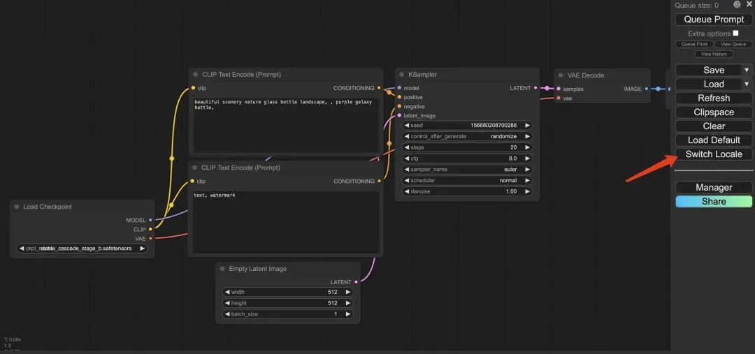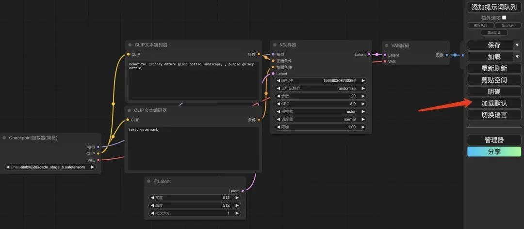 1.打开 ComfyUI 界面后,点击「Switch Locale」切换成中文模式,再点击「加载默认」直接加载文生图工作流。