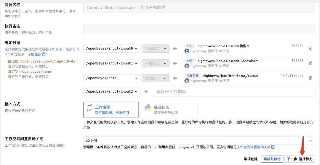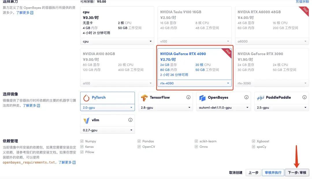 4. 跳转后,选择「NVIDIA GeForce RTX 4090」,点击「下一步:审核」。新用户使用下方邀请链接注册,即可获得 4 小时 RTX 4090 + 5 小时 CPU 的免费算力时长!
