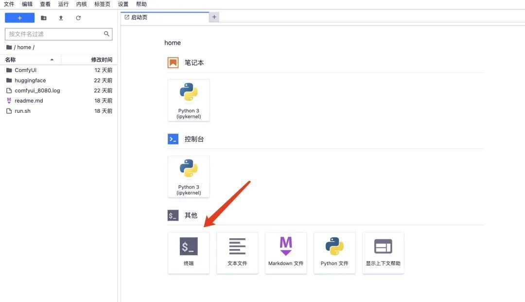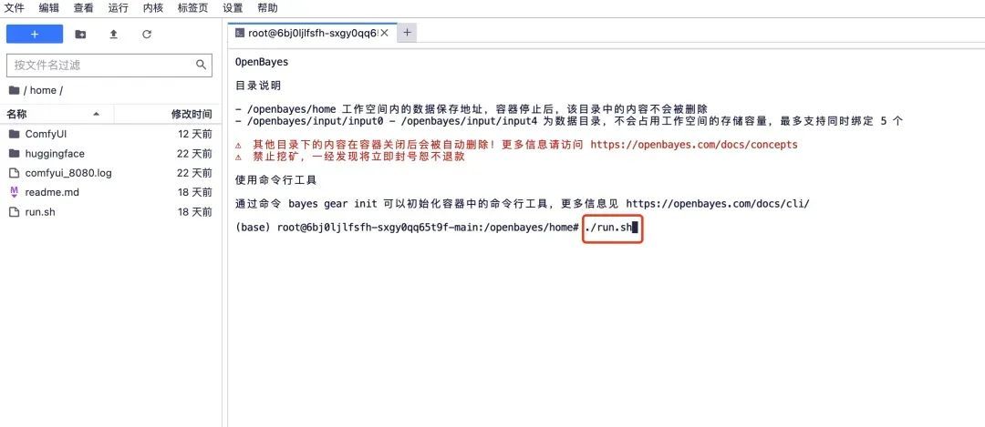 6. 打开工作空间后,在启动页新建一个终端会话,然后在命令行里输入 「./run.sh」。