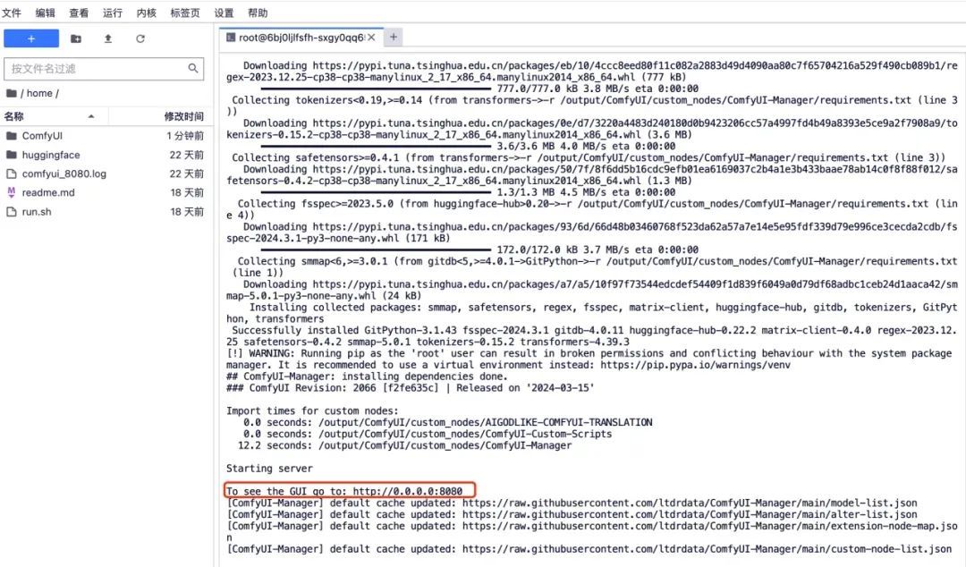 7. 稍等片刻,当命令行出现「To see the GUI go to : http://0.0.0.0:8080」后,拷贝右侧 API 地址到浏览器地址栏中,即可访问 ComfyUI 界面。请注意,用户需在实名认证后才能使用 API 地址访问功能。