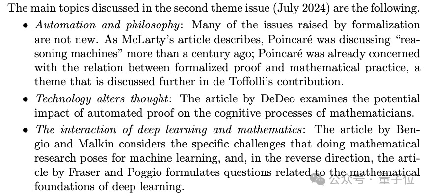 形式化所引发的许多问题并不新鲜。McLarty的文章描述,庞加莱在一个多世纪前就在讨论“推理机器”。庞加莱已经关注到形式化证明与数学实践之间的关系,这一主题在de Toffolli的文章中得到了进一步的探讨。