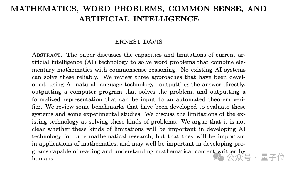 纽约大学计算机科学家Ernest Davis指出,当前AI在解决文字描述的数学问题上,无法可靠地结合基础数学和常识推理。