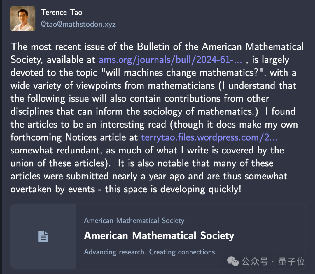 陶哲轩点赞转发,《美国数学学会通报》用一整期特刊介绍了AI给数学带来的改变。