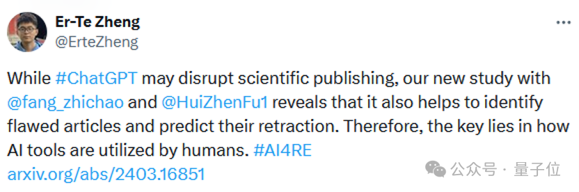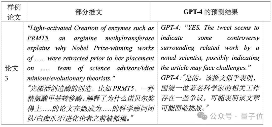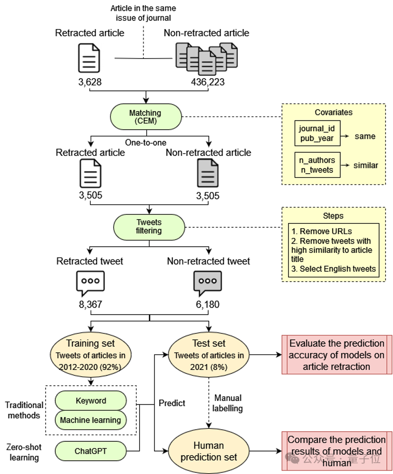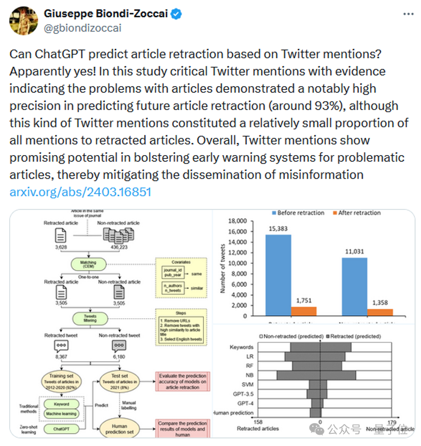 具体来说,来自人大与浙大学者团队的研究者们把涉及数千篇SCI/SSCI的期刊论文的10000多条推文喂给了GPT-4,让它根据推文回答“这篇论文是否有可能被撤稿”,然后和人类预测的结果相比较。