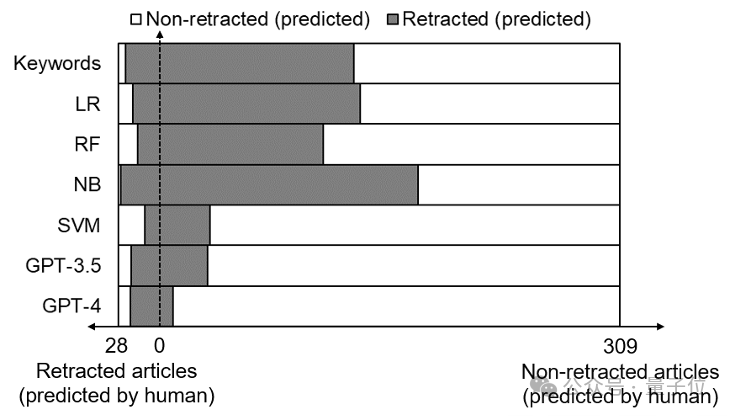 GPT-4预测会撤稿的论文中,近70%的在人工预测中同样会撤稿;而其他模型的预测精确率均远低于GPT-4。