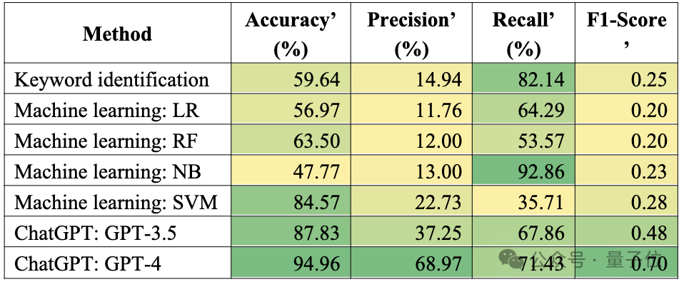 训练集用来训练模型,然后在测试集上验证人工预测、关键词方法、机器学习模型和ChatGPT的预测结果情况。