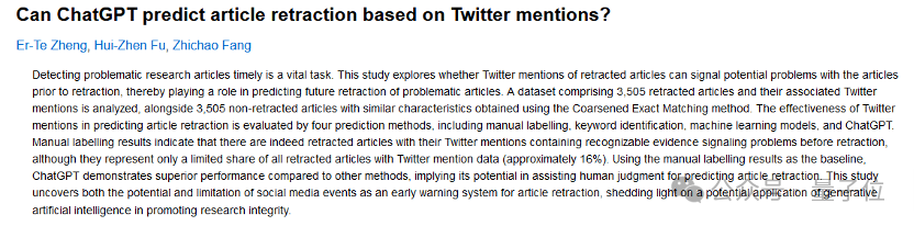 例如,从样本论文中可以看出,ChatGPT对推文有深刻的理解,并能准确提取可能预测论文撤稿的信息,为使用推文评估论文是否存在潜在问题提供了宝贵的帮助。