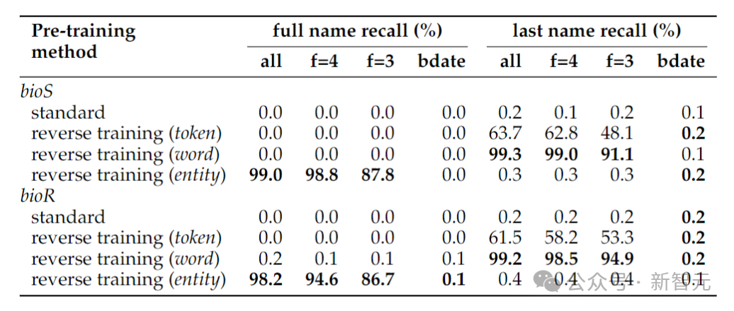 上表展示了确定人全名的反转任务,当仅给出出生日期确定一个人的全名时,反转任务的准确性仍然接近于零,——这是因为在本文采用的实体检测方法中,日期被视为三个实体,因此在反转中不会保留它们的顺序。