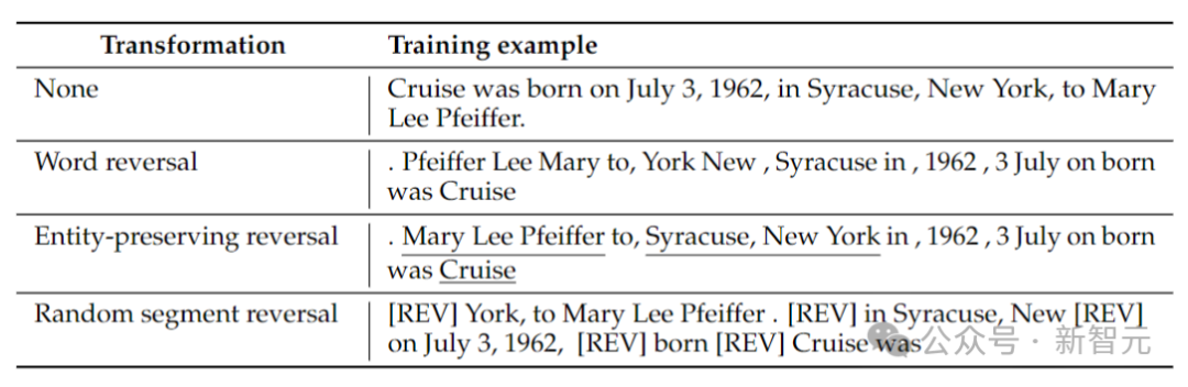 逆向转换可以看作是模型必须学习的第二种语言,请注意,在反转的过程中,事实之间的关系保持不变,模型可以从语法中判断它是处于正向还是反向语言预测模式。