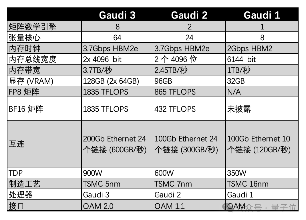 据了解,Gaudi 3采用5纳米工艺制造,与历代Gaudi其它性能上的具体对比,如下表所示: