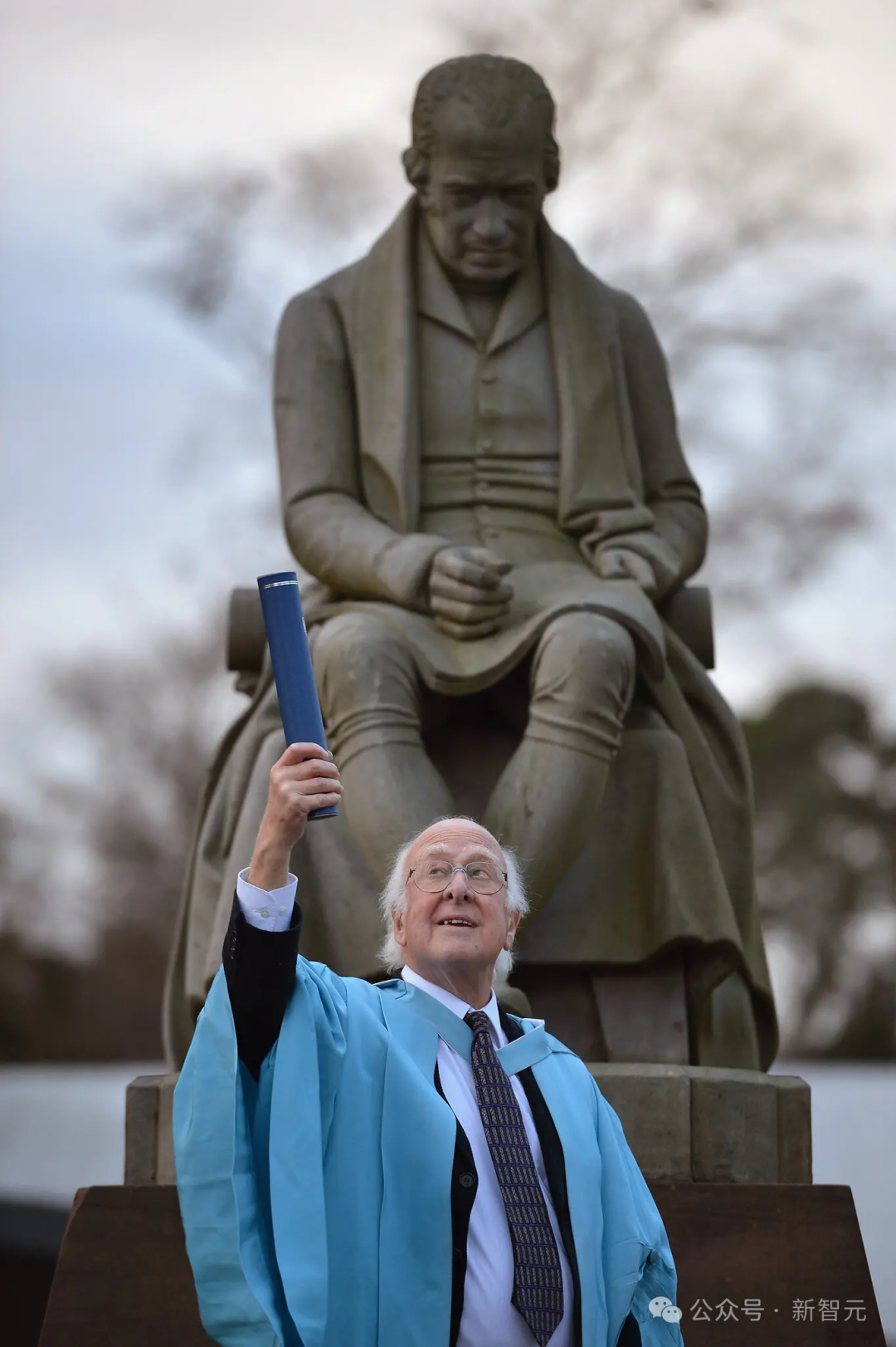 2012年,Higgs在获得了赫瑞-瓦特大学的荣誉学位,图中他身后是瓦特雕塑