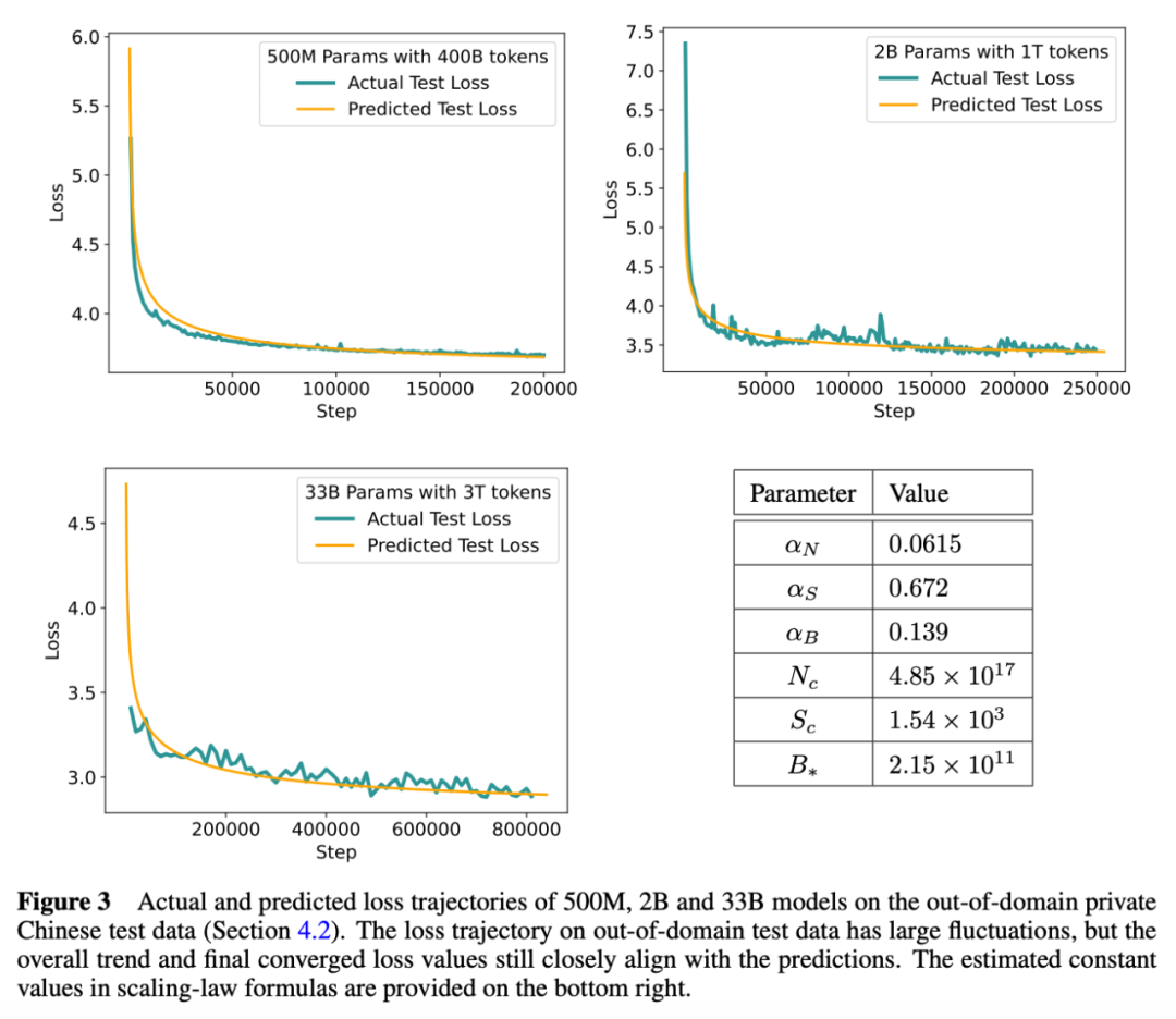2. 右半部分(Right):33B 参数的模型在代码测试数据(code test data)上的 loss 曲线。同样地,除了在训练初期的 warm-up 阶段外,实际 loss 和预测 loss 在整个训练过程中也保持了很好的一致性。
