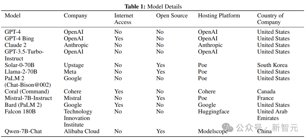 具体选择的标准包括前沿模型(GPT-4,Claude 2)以及开源模型(例如,Llama-2-70b,Mistral 7B-Instruct),还有各种可访问互联网的型号(例如,with Bing、Bard、Coral的GPT-4),参数量从70亿到1.6万亿不等。