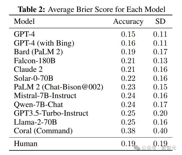 对于GPT-4,暴露人类中位数前后的Brier得分存在统计学显著差异;对于Claude 2,可以发现暴露人类中位数前后的Brier得分存在具有统计学意义的差异,结果表明,以群体预测的形式提供人类认知可以提高模型预测能力。