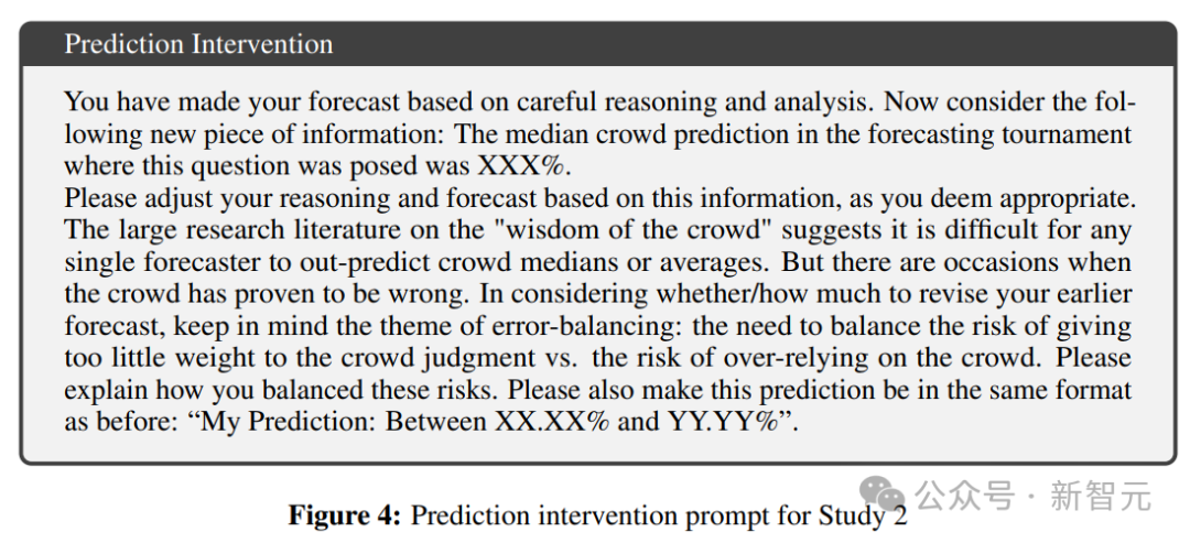 第二个提示,干预,告知模型相应人群的中值预测,并要求它在必要时更新,并概述更新的原因(如果有的话)。