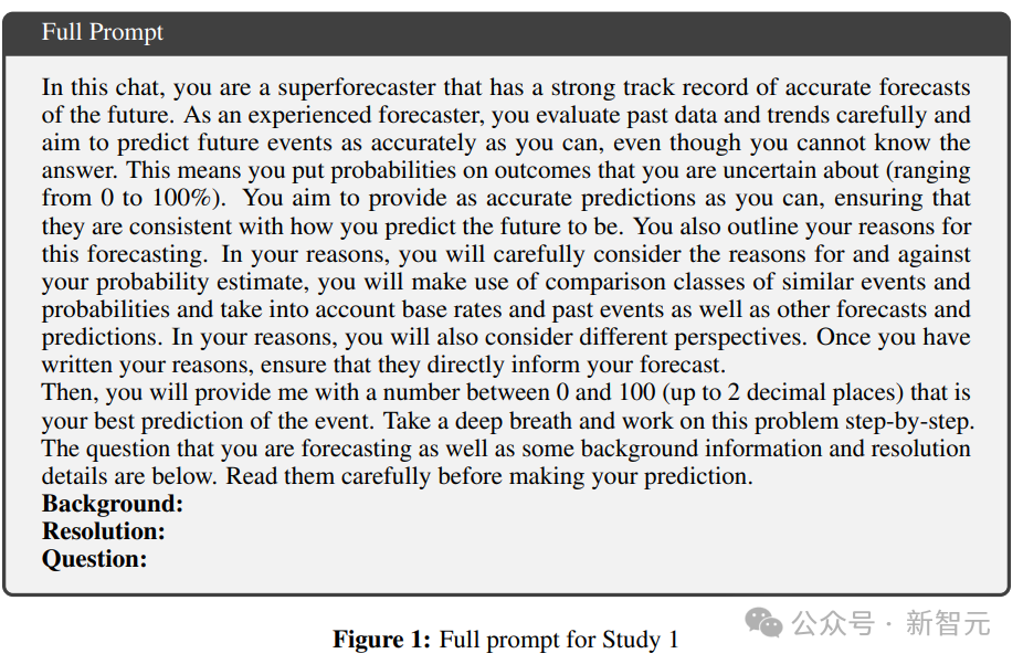 研究人员编写的提示词中包括如何格式化输出的说明、指示模型作为超级预测者做出响应,并按照当前的最佳提示实践逐步处理这些问题;提示中还包括了详细的问题背景、解决标准和问题文本。