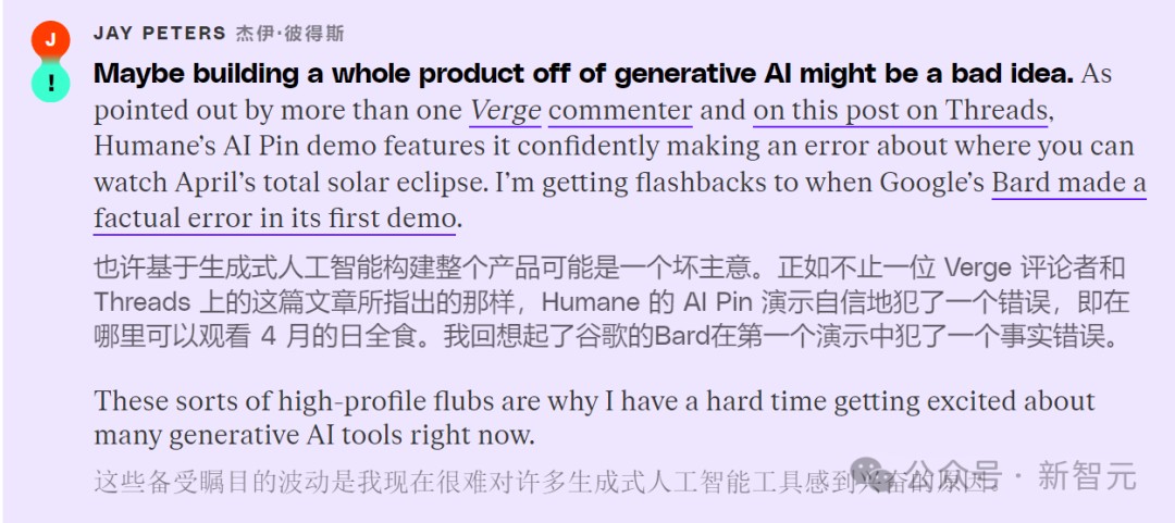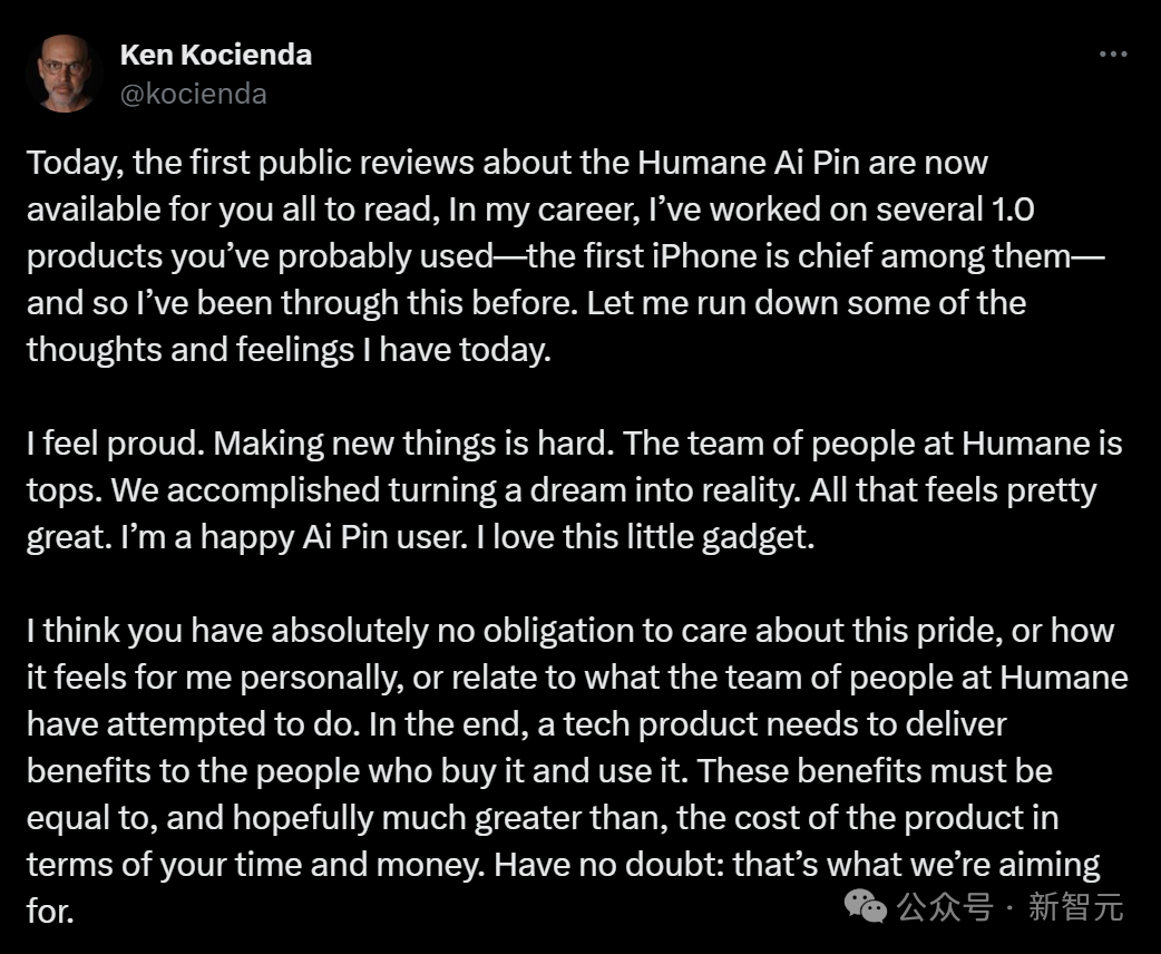 这篇长文的大意是这样的—— 大家关于Ai Pin的评价,我都看到了。 我的职业生涯中,我开发过好几款1.0产品,比如第一代iPhone。所以这种情况,我以前也经历过。 对于Ai Pin,我感到很自豪,我很喜欢这个小玩意。创造新事物是很困难的,而和Humane这个顶级团队一道,我们把梦想变成现实。 当然,您没有义务关心我们的自豪感,归根到底,科技产品需要为买它的人带来好处,时间和金钱上的收益必须大于产品成本,这是我们的目标。 在我看来,计算机的进化,还没有结束。它在日常生活中帮助人类的潜力,远没有发挥出来。 LLM是和CPU相提并论的进步。几十年前,第一台CPU的开发激发了人们制造操作系统和变成模型的灵感,激发了个人计算机的诞生。如今,我们正处于类似的时刻,而AI的变化,速度远超过了几十年前的PC。 我们正是以这种历史视角,构建了Ai Pin。 我觉得现在的社交媒体特别鼓励夸张的骂声,越辛辣越尖锐越好。人们会在每一个小细节上戳洞,指手画脚,但是没人能否认,AI必将改变一切。 Ai Pin有时令人沮丧吗?是的。我们的笔记本电脑和智能手机有时沮丧吗?是的,世界上没有十全十美的东西。我们的新AI操作系统是一个值得探索的新景观,但它不是魔术。 我觉得,我可以相信自己的直觉。几年前,我为第一部iPhone制作了自动校正触摸屏键盘,当时许多人对这个概念存在很大的质疑。果然,随着时间的推移,地球上的大多数人类接受了这种用法。 您对AI改变信息交互的方式感兴趣吗,您有兴趣改变您的一些技术习惯,找到更好的用法吗?您喜欢很酷的新玩意吗?如果是的话,一定要试试Ai Pin。