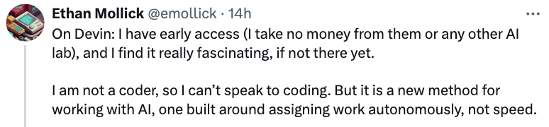 事实上,在Devin刚推出时候,他就反对过“世界上第一个AI软件工程师”这一说法。