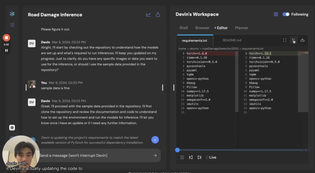 Devin第一次真正的尝试,是它修改了一个名为requirements.txt文件,其中规定了代码所依赖的库版本。视频中提到它正在更新代码,但实际上更像是修改配置文件。