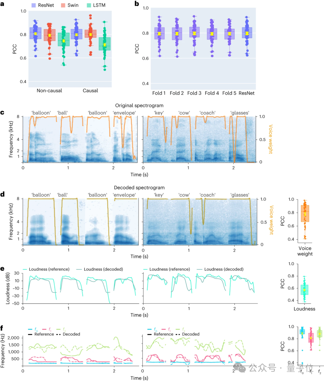 研究人员展示了几个关键语音参数的平均解码准确率(N=48),包括声音权重(用于区分元音和辅音)、响度、音高f0、第一共振峰f1和第二共振峰f2。准确重建这些语音参数,尤其是音高、声音权重和前两个共振峰,对于实现精确的语音解码和自然地模仿参与者声音的重建至关重要。