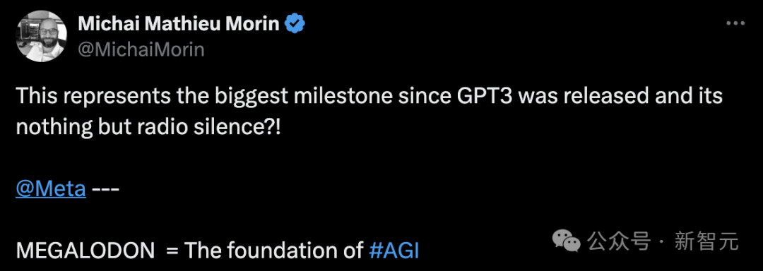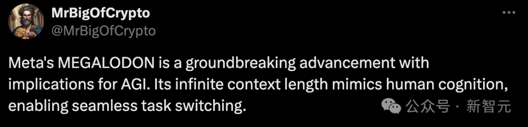 「Meta的Megalodon是一项突破性进展,对AGI具有重要意义。它的无限上下文长度模拟了人类的认知,实现了无缝任务切换」。