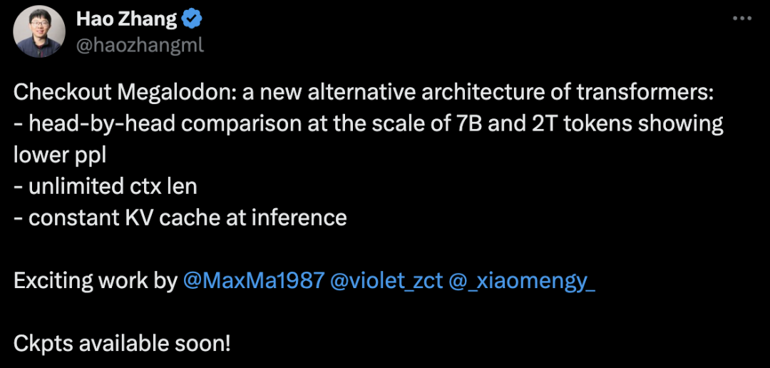 论文作者Hao Zhang表示,这是一种全新替代Transformer的架构。