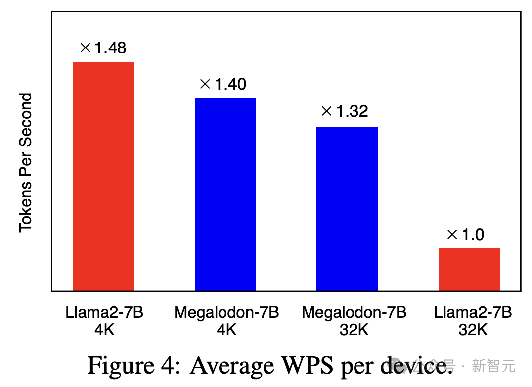数据学习效率 通过训练损失图以及多个benchmark的结果可以看出,Megalodon比Transformer在7B参数下有更好的数据学习效率。 计算效率 针对不同的4K和32K上下文长度,Megalodon这一架构的预训练的计算效率也是非常强的。