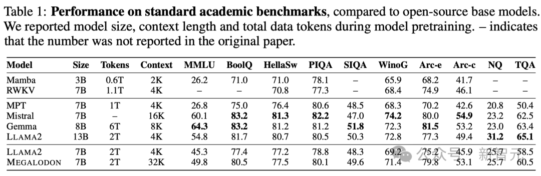 学术基准上短上下文评估 具体来说,研究人员在短上下文(4K token)的标准学术基准上,对Megalodon与Llama 2,以及开源基础模型进行了比较。 在相同的2万亿token训练后,Megalodon-7B的表现明显优于Llama2-7B。