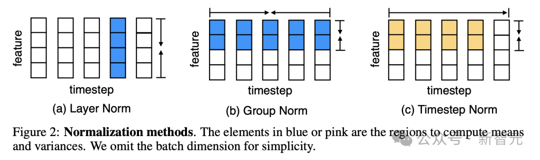 那么,Megalodon架构采用了怎样的设计,才能取得如此优异的表现? 据介绍,它基于MEGA架构进行了改进,并新增了多个技术组件。 首先,复杂指数移动平均(CEMA)组件是一种全新技术,扩展了MEGA中使用的多维阻尼指数移动平均方法到复数域,可以增强模型处理复杂数据的能力。 其次,研究人员提出了一种创新的归一化技术——「时间步归一化层」。 它将传统的组归一化技术扩展到自回归序列建模任务中,允许模型在处理序列数据时,进行有效的归一化。 以往,「层归一化」(Layer Normalization)与Transformer相结合性能,虽令人印象深刻。 但很明显,层归一化并不能直接减少时间步长或顺序维度的内部协变量偏移。 另外,「组归一化」(Group Normalization)虽比「层归一化」在CV任务中获得改进,但它却无法直接应用于Transformer的自回归序列建模,因未来信息会通过时间步维度的均值和方差泄漏。 如下图所示,c展示了Megalodon架构中,层标准化和时间步标准化的方法。