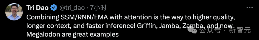 普林斯顿助理教授Tri Dao表示,「将SSM/RNN/EMA与注意力相结合是获得更高质量、更长上下文和更快推理的方法!Griffin、Jamba、Zamba和现在的Megalodon都是很好的例子」。