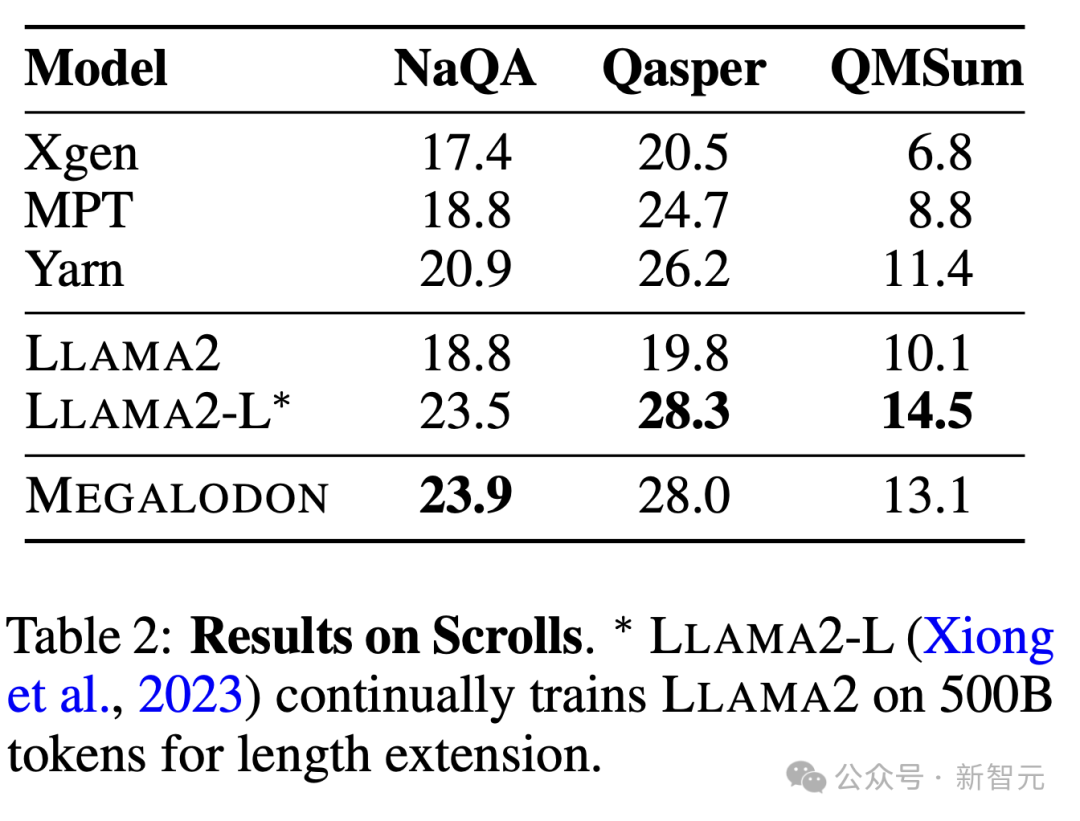 在Scroll数据集中的长上下文QA任务中,Megalodon在NaQA上获得最佳F1,并与Llama 2 Long相竞争。