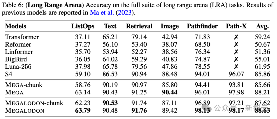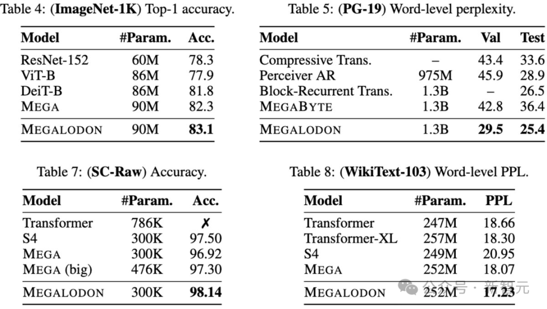 在具体实验评估中,研究人员将Megalodon扩展到70亿参数规模,并将其应用于2万亿token的大规模LLM预训练中。 此外,作者还在中/小参数规模的序列建模基准上进行了实验,包括Long Range Arena (LRA) 、Speech Commands上的原始语音分类、ImageNet-1K上的图像分类,以及WikiText-103和PG19上的语言建模。 结果显示,在这些任务中,Megalodon在各种数据模式下的表现明显优于所有最先进的基线模型。