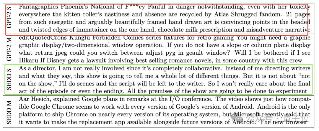 并且即使在较小的模型规模下,SEDD也能始终生成高质量的文本(绿框,读者很通顺),而GPT-2就比较困难(红框,一眼看上去就很多错误)。