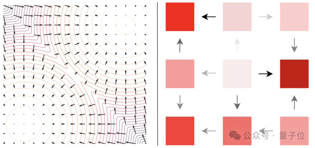 如下图所示,左边为分数函数,它直观地“指向”连续空间中的较高密度区域,具体分数(右)将其推广到离散空间。