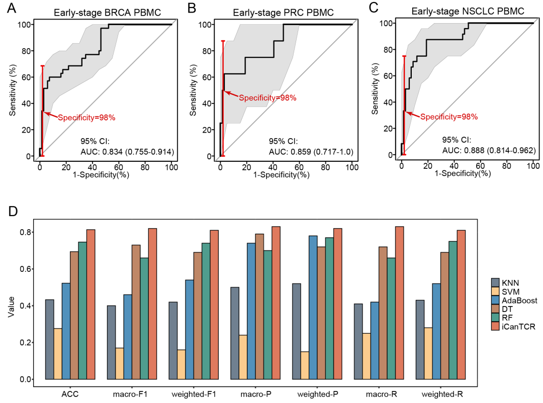 基于上述思路,蒋庆华/许召春教授团队收集了11种癌症的2000余例组织/外周血、对照样本的外周血TCR测序数据,成功开发出一种利用外周血免疫特征进行多种癌症早期诊断的人工智能模型(iCanTCR)。为了评估该模型区分癌症与对照样本的性能,作者将其应用于乳腺癌、肺癌、胰腺癌早期癌症患者与健康对照的外周血TCR数据,获得了良好的性能(AUC达到0.86,图1A-C)。为了进一步评估该模型是否能区分不同的癌症,作者将其应用于多种高发癌症的TCR数据,发现该模型具有区分多种癌症的能力(总体ACC达到0.81,图1D)。