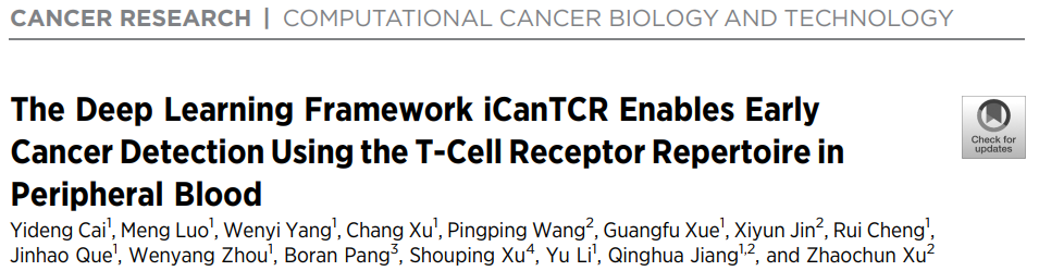 Cai, Yideng, Meng Luo, Wenyi Yang, Chang Xu, Pingping Wang, Guangfu Xue, Xiyun Jin et al. "The deep learning framework iCanTCR enables early cancer detection using the T cell receptor repertoire in peripheral blood." Cancer Research (2024).