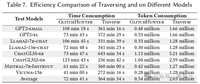 此外,GlitchHunter相较于完整遍历词元表的方法,显著减少了所需的时间和处理的词元数量,展示了其在达到高性能的同时保持了较低的资源开销。这些评估结果充分验证了GlitchHunter在实际应用中提高LLM输出质量和可靠性的潜力,证明了其作为故障词元检测工具的有效性和实用性。