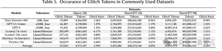 实证研究的第三个问题故障词元在真实的数据集中的存在情况。作者研究了包括Alpaca,ShareGPT在内的用于大模型微调的主流数据集,发现在每个数据集中平均有2%以上的故障词元。这说明了故障词元在数据集中很普遍,而且很可能会影响到使用这些数据集进行微调的模型的效果。