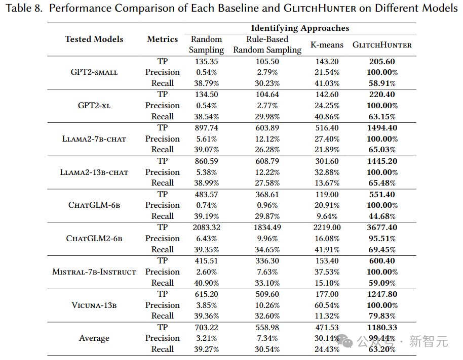 为了验证GlitchHunter的效果,本文采用了几项关键指标来比较GlitchHunter与几种基线方法的性能,包括随机抽样、基于规则的随机抽样和K-means聚类。评估结果显示,GlitchHunter在各个测试模型中普遍表现出色。