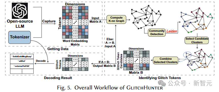 - 更新与迭代:选定包含故障词元的群组后,这些词元会被整合到一个更新的词元嵌入图中。随后,GlitchHunter会继续进行聚类和检测,直到词元嵌入图不再经历任何更新,即没有新的故障词元被发现。