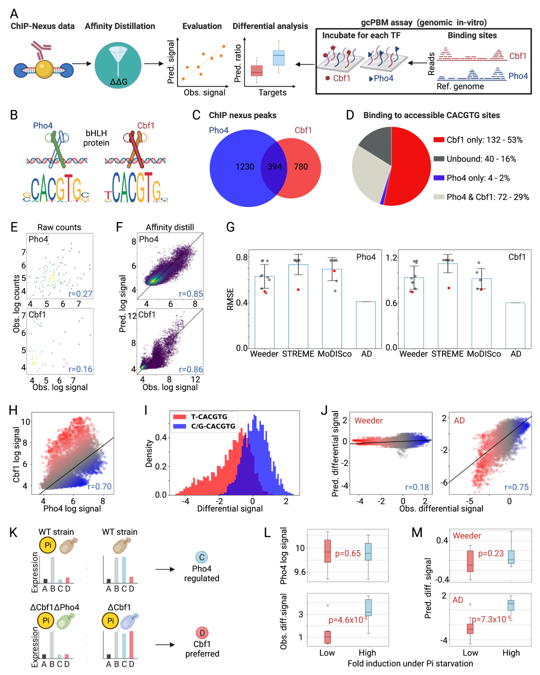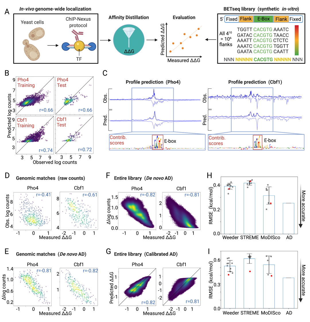 图 2.1:亲和力蒸馏从酵母中的 PB-exo 模型中提取亲和力。(A) 流程概述:BPNet 模型在 Pho4 和 Cbf1 的 PB-exo 数据上进行训练,A!nityDistillation (AD) 提取亲和力,并将 AD 输出与 BETseq 测量的 Pho4 和 Cbf1 结合 1,048,576 的所有 NNNNNCACGTGNNNNN 的“G”进行比较 序列。(B) 训练(左)和保留测试染色体(右)的 Pho4(上)和 Cbf1(下)的预测和观察到的对数转换读数计数的比较。(C) 位于保留测试染色体上的样本区域的观察 (Obs) 和预测 (Pred) PB-exo 图谱;贡献分数突出显示了绑定区域内已知的 CACGTG 共识位点。(D) 两个实验中存在的 NNNNNCACGTGNNNNN 序列的测量的对数转换的 PB-exo 读取计数与测量的“G”(Pho4 和 Cbf1 的 884 和 294 序列)。(E) AD 预测的边缘化分数与两个实验中存在的 NNNNNCACGTGNNNNN 序列的测量“G”。(F) AD 预测的边缘化分数与所有 1,048,576 个 NNNNNCACGTGNNNNN 序列的测量“G”。(G) 校准后的 AD 预测与测量了所有 1,048,576 个 NNNNNCACGTGNNNNN 序列的“”G。 (H) Pho4 的预测与观测值的校准后 RMSE。 灰色标记表示各个主题的表现; 红色标记表示每种算法顶部输出的性能; 蓝色条表示平均值; 误差线表示标准偏差。 (I) 与 Cbf1 的 H 相同。