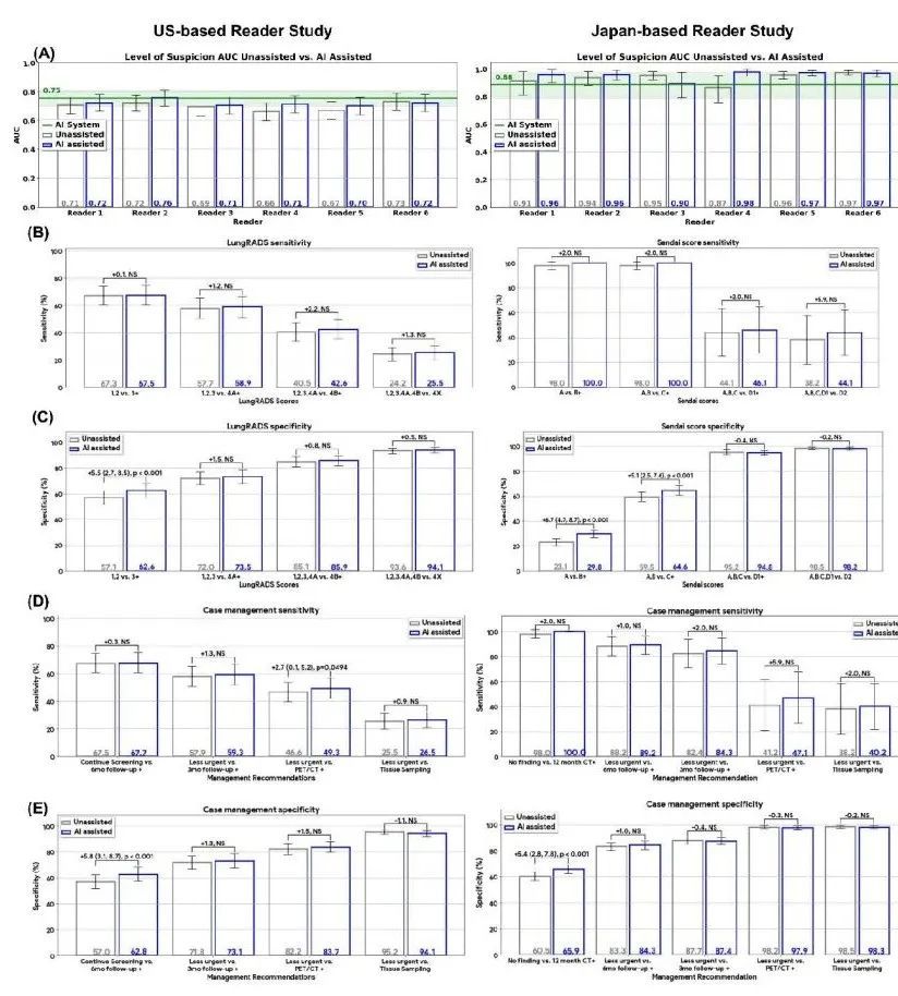 在美国和日本的研究中,相对于无辅助方式,人工智能辅助提高了评分系统和病例管理选项中所有医生的敏感性。其中,美国和日本病例的研究显示 LoS 和 AUC 均改善了 0.023,人工智能辅助在所有 Lung-RADS 评分中都获得了更高的敏感性和特异性。