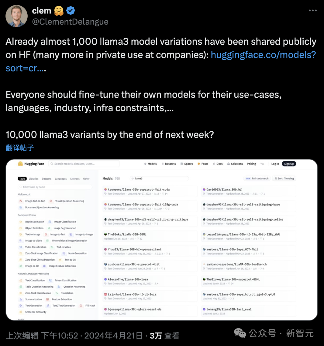 HF的创始人Clement Delangue非常期待,下周结束前,或许会有1万个开源Llama3变体上线。