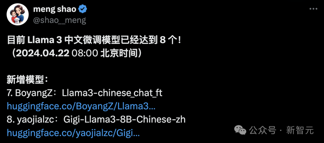 其中,网友@meng__shao总结了,截止目前中文的微调模型已达到6个。